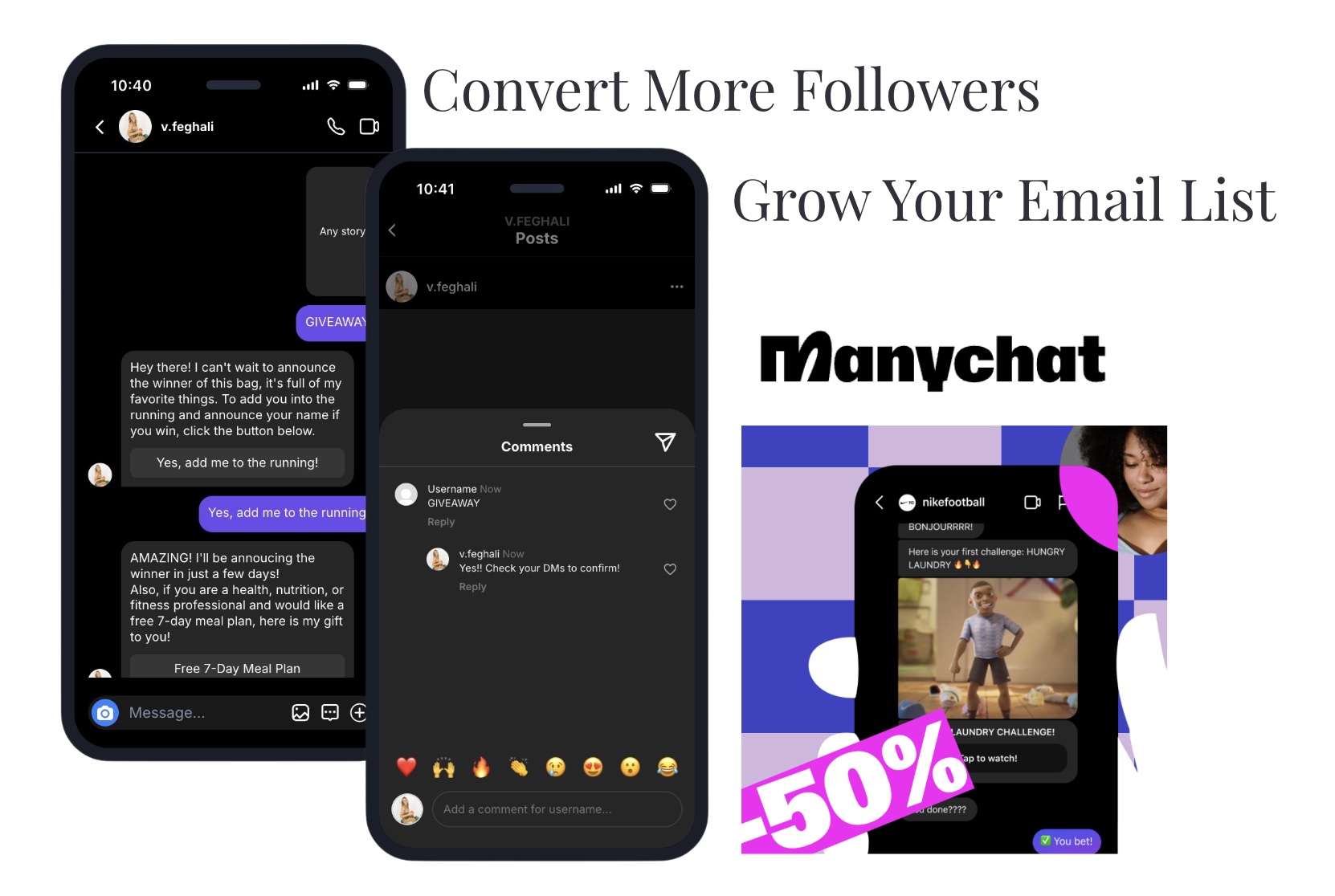 We use Manychat to grow our email list, engage with more followers, and help manage our DMs. Whenever you can automate or delegate, you should do so. Using Manychat is one of many examples of how we do this.